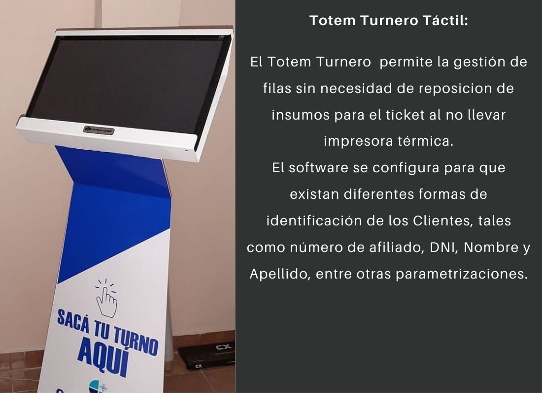 Optimiza la gestión de colas de espera en tu empresa con el Turnero Totem Nube, un producto versátil y de fácil instalación diseñado para adaptarse a tus necesidades. Configura las áreas de atención, motivos de consulta y otros aspectos según tus requerimientos. Su diseño simple y estético ofrece una experiencia confortable para los usuarios.